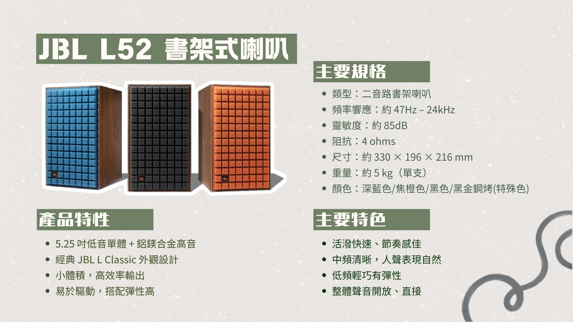 JBL L52 Classic 保有經典監聽風格,聲音直接、有活力,帶點復古的厚度;